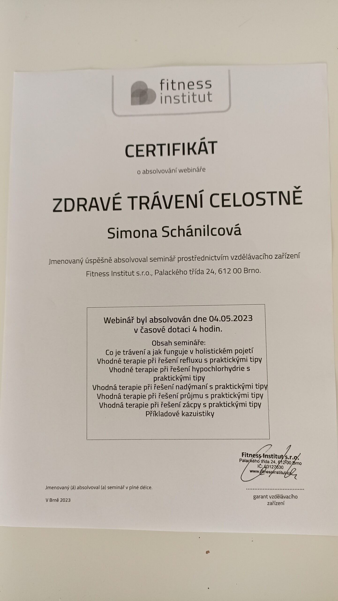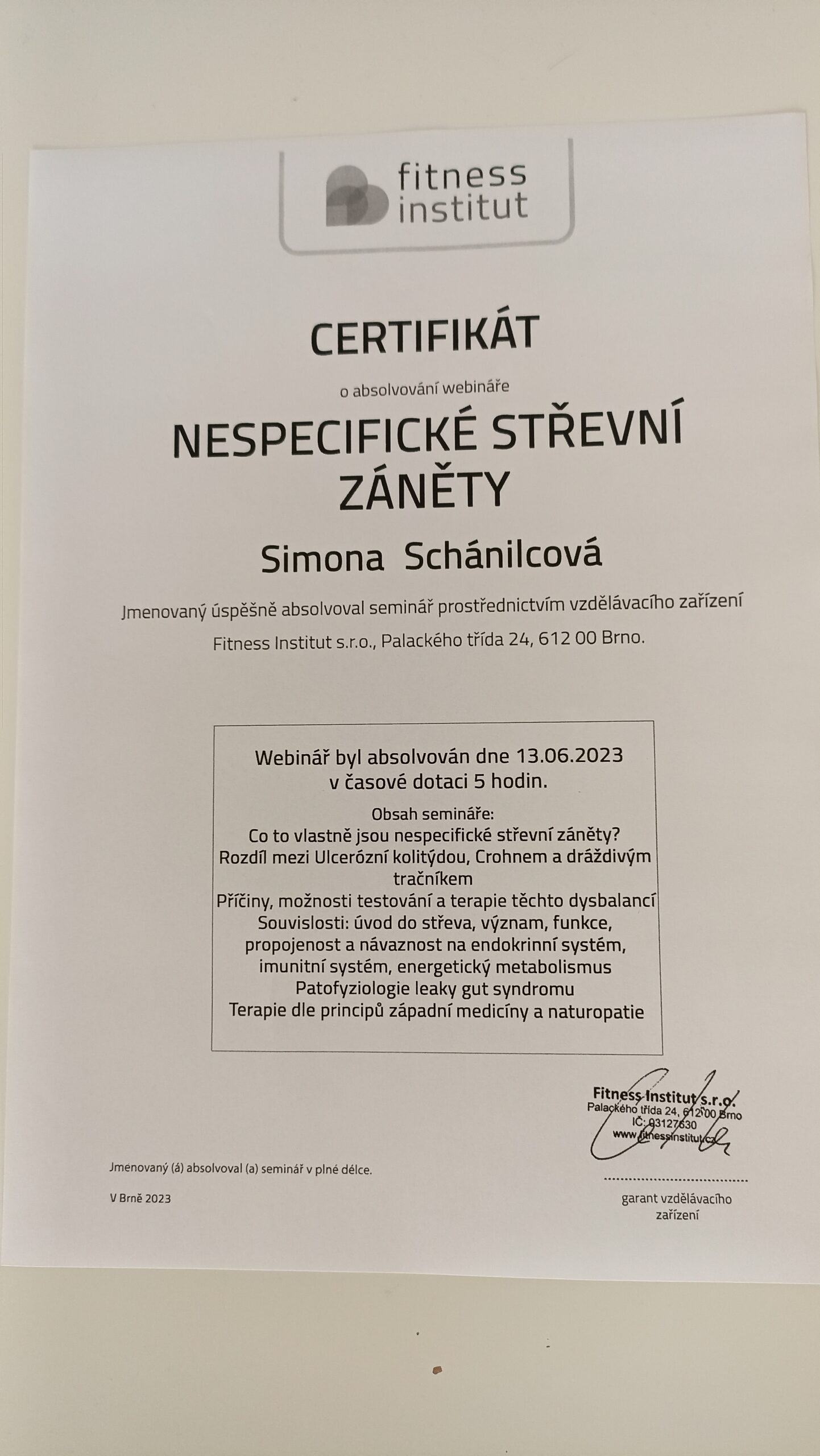 Další velkou školou mého života a propojení západní a východní medicíny je Škola klinické naturopatie, kde jsem absolvovala mnoho seminářů. Volné chvíle na mateřské dovolené jsem trávila poslechem odborných podcastů a hlavně četbou specializovaných knih, které mi pomáhají v sestavování komplexního personalizovaného plánu pro klienty. Neustále se vzdělávám v oblasti výživy, prevence a celostního přístupu ke zdraví.